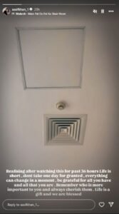 “36 घंटे से इसे देखने के बाद एहसास हुआ कि जिंदगी बहुत छोटी है। एक दिन को ग्रांटेड मत लीजिए। सब कुछ पलभर में बदल सकता है। आपके पास जो कुछ भी है, उसके लिए आभार व्यक्त कीजिए। याद कीजिए कि आपके लिए सबसे जरूरी क्या है और उसे याद रखिए। जिंदगी एक तोहफा है और हम लोग खुशकिस्मत हैं।”