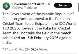 सरकार ने एक्स पर एक पोस्ट कर कहा, “इस्लामिक रिपब्लिक ऑफ पाकिस्तान की सरकार, पाकिस्तान क्रिकेट टीम को ICC वर्ल्ड T20 2026 में हिस्सा लेने की मंजूरी देती है। हालांकि, पाकिस्तान क्रिकेट टीम 15 फरवरी 2026 को भारत के खिलाफ होने वाले मैच में मैदान पर नहीं उतरेगी।”