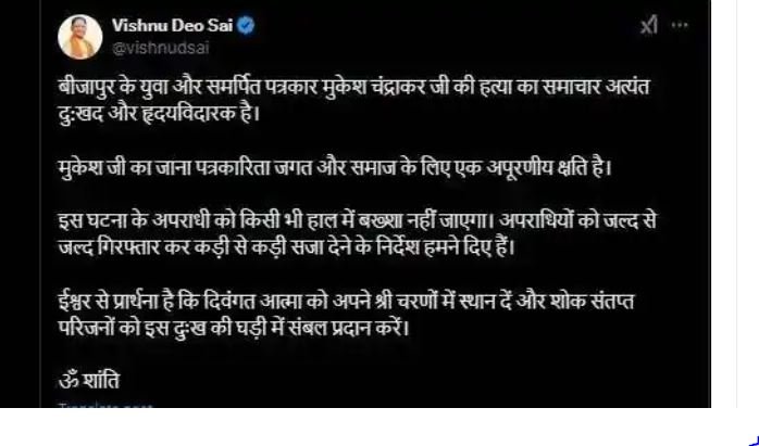 सीएम विष्णुदेव साय ने पत्रकार मुकेश की हत्या पर शोक जताया है। उन्होंने एक्स पर लिखा बीजापुर के युवा और समर्पित पत्रकार मुकेश चंद्राकर की हत्या का समाचार अत्यंत दु:खद और हृदयविदारक है। मुकेश जी का जाना पत्रकारिता जगत और समाज के लिए एक अपूरणीय क्षति है। इस घटना के अपराधी को किसी भी हाल में बख्शा नहीं जाएगा। अपराधियों को जल्द से जल्द गिरफ्तार कर कड़ी से कड़ी सजा देने के निर्देश हमने दिए हैं।