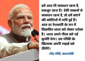PM मोदी ने कहा – हमें आज भी सावधान रहना है, एकजुट रहना है। ऐसी ताकतों से सावधान रहना है, जो हमें बांटनें की कोशिशों में लगी हुई हैं। आज हर देशवासी के मन में विकसित भारत को लेकर भरोसा है। भारत अपने गौरव को नई बुलंदी देगा। हम गरीबी के खिलाफ अपनी लड़ाई को जीतेंगें।