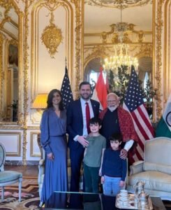 PM Modi Meet US Vice President Family: पीएम मोदी फ्रांस के दौरे पर हैं और इस दौरान उन्होंने एआई समिट में भाग लिया। इसके बाद उन्होंने अमेरिका के उपराष्ट्रपति वेडी जेंस के बेटे के बर्थडे में शामिल हुए, इस दौरान उन्होंने जेडी वेंस की भारतीय मूल की पत्नी ऊषा और बेटों से मुलाकात की और ‘बर्थडे बॉय’ को गिफ्ट भी दिया। पीएम मोदी ने वेंस की फैमिली के साथ फोटो भी शेयर की जिसमें पीएम मोदी वेंस की पत्नी ऊषा और उनके बेटे इवान और विवेक के साथ खड़े हैं।