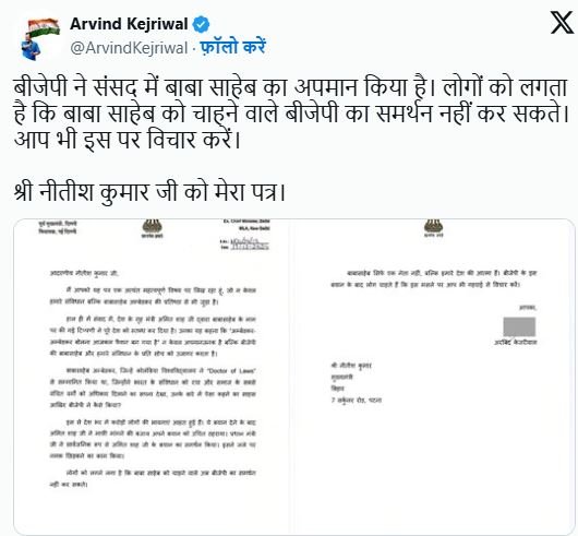 बाबा साहेव अंबेडकर के मुद्दे पर पूरे देश में सियासी घमासान मचा हुआ है. कांग्रेस सहित कई विपक्षी दल अमित शाह के उस बयान का विरोध कर रहे हैं, जो उन्होंने संसद में दिया था. शाह के इस बयान के बाद खासकर कांग्रेस कुछ ज्यादा ही आक्रामक है. संसद में इसको लेकर लगातार मार्च हो रहा है. विपक्षी सांसद विरोध प्रदर्शन कर रहे हैं. वहीं, इस बीच आम आदमी पार्टी के राष्ट्रीय संयोजक अरविंद केजरीवाल ने बिहार के मुख्यमंत्री नीतीश कुमार और आंध्र प्रदेश के सीएम चंद्रबाबू नायडू को चिट्ठी लिखी है.