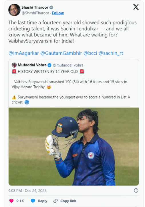 कांग्रेस सांसद और क्रिकेट प्रेमी शशि थरूर ने सोशल मीडिया प्लेटफॉर्म X पर वैभव की खुलकर तारीफ की। उन्होंने लिखा कि-‘पिछली बार जब 14 साल की उम्र में किसी खिलाड़ी ने ऐसा खेल दिखाया था तो वह सचिन तेंदुलकर थे पूरी दुनिया जानती है कि सचिन आगे चलकर क्या बने। थरूर यहीं नहीं रुके । उन्होंने टीम इंडिया के हेड कोच गौतम गंभीर और चीफ सिलेक्टर अजीत अगरकर को टैग करते हुए कहा कि अब इंतजार का कोई मतलब नहीं है वैभव सूर्यवंशी को मौका मिलना चाहिए।’