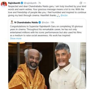 “सुपरस्टार रजनीकांत गारू को सिनेमा में 50 शानदार साल पूरे करने पर बधाई। अपने उल्लेखनीय करियर के दौरान, उन्होंने न केवल अपने शानदार अभिनय से लाखों लोगों का मनोरंजन किया है, बल्कि अपनी फिल्मों को सामाजिक जागरूकता बढ़ाने के माध्यम के रूप में भी इस्तेमाल किया है। उनके काम ने ज्वलंत सामाजिक मुद्दों पर चिंतन को प्रेरित किया है और अनगिनत लोगों के जीवन को अर्थ और उद्देश्य से छुआ है। मैं उन्हें अपनी शुभकामनाएं देता हूं।