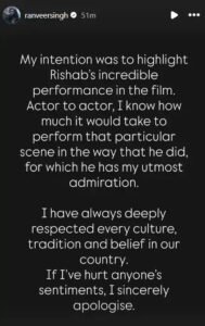 ‘मेरा इरादा फिल्म (कांतारा) में ऋषभ की शानदार परफॉर्मेंस को उजागर करने का था। एक अभिनेता होने के नाते, मैं जानता हूं कि उस खास सीन को जिस तरह से उन्होंने निभाया, उसके लिए कितनी मेहनत लगती है और इसके लिए मैं उनका अत्यधिक सम्मान करता हू। मैंने हमेशा हमारे देश की हर संस्कृति, परंपरा और आस्था का गहरा सम्मान किया है। अगर मेरी किसी बात से किसी की भावनाएं आहत हुई हैं, तो मैं दिल से माफी चाहता हूं।’