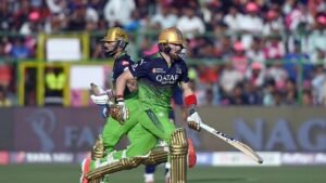 पहले बल्लेबाजी करने उतरी बेंगलुरु टीम से फिल सॉल्ट और विराट कोहली ओपनिंग करने उतरे। इसमें से विराट कोहली ने 13 गेंदों में 3 चौके लगाकर 19 रन बनाकर पवेलियन लौट गए। फिल सॉल्ट ने 30 गेंद पर अपनी फिफ्टी पूरी की। उनका इस सीजन का यह दूसरा अर्धशतक है। फिर 38 गेंद में 4 चौके और 3 छक्कों की मदद से 63 रन बनाकर आउट हो गए। वहीं पडिक्कल 13 गेंदों में 18 रन बनाकर आउट हो गए, जिसमें 1 चौका और 1 छक्का शामिल रहा।