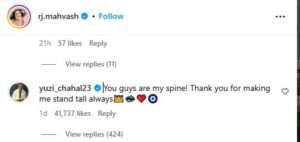 और कैप्शन में लिखा है कि- ‘अपने लोगों का हर मुश्किल समय में साथ देने और उनके पीछे चट्टान की तरह खड़े रहने के लिए! हम सब आपके साथ हैं @yuzi_chahal23 💫🧿’ कैप्शन और गाने से साफ तौर पर पता चलता है, कि आरजे अपने और चहल के रिलेशनशिप में आने के हिंट दे रही हैं। यूजर जमकर इस पर रिएक्ट कर रहें हैं।