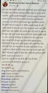 फेसबुक पोस्ट में लिखा गया कि- “सभी भाइयों को आज जो ये मुंबई में (शेट्टी टावर) फिल्म डायरेक्टर रोहित शेट्टी के घर पर फायरिंग हुई है, उसकी जिम्मेदारी शुभम लोनकर, आरजू बिश्नोई, हरि बॉक्सर, हरमन संधू हम लेते हैं। हमने इसको बहुत बार मैसेज लगाया कि हमारे काम में दखल ना दे, लेकिन इसको समझ में नहीं आया। इसको ये छोटा सा ट्रेलर दिया है। ”