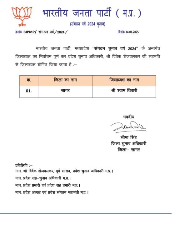 Sagar News:मध्य प्रदेश भाजपा ने कई जिलाें में जिला अध्यक्ष की घाेषणा कर दी है, आपकाे बता दें की सागर में भी भारतीय जनता पार्टी मध्यप्रदेश द्वारा संगठन पर्व 2024 के अंतर्गत जिला अध्यक्ष निर्वाचन पूर्ण करते हुए प्रदेश चुनाव अधिकारी विवेक शेजवलकर की सहमती से सागर जिला अध्यक्ष पद पर श्याम तिवारी को नियुक्त किया है।