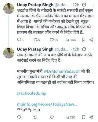 स्कूल शिक्षा मंत्री उदय प्रताप सिंह ने मामले को गंभीरता से लेते हुए जांच के आदेश दिए हैं। शिक्षा सचिव और लोक शिक्षण आयुक्त को मामले की विस्तृत जांच का जिम्मा सौंपा गया है। मंत्री ने स्पष्ट कहा कि मुख्यमंत्री मोहन यादव की सरकार में भ्रष्टाचार किसी भी सूरत में बर्दाश्त नहीं किया जाएगा।