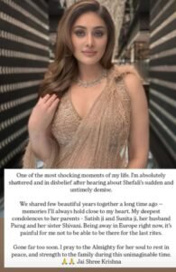 “शादी टूटने के बावजूद हम जब भी किसी पार्टी या इवेंट में मिलते, एक-दूसरे का दिल से स्वागत करते थे। शेफाली का यूं अचानक चले जाना बेहद दुखद है।”