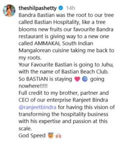 वीडियो में शिल्पा ने बताया कि बैस्टियन का बांद्रा आउटलेट अब एक नए साउथ इंडियन रेस्टोरेंट ‘अम्माकाई’ (AmmaKai) में तब्दील किया जाएगा। वहीं बैस्टियन का ब्रांड अब जुहू में शिफ्ट किया जा रहा है। इसके साथ ही फैंस के लिए एक और बड़ी खबर यह है कि बैस्टियन बीच क्लब भी री-ओपन होने जा रहा है।