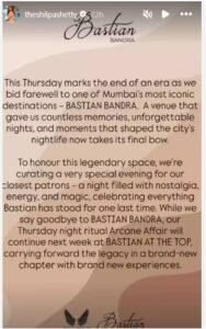 शिल्पा ने 2 सितंबर को इंस्टाग्राम पर एक इमोशनल पोस्ट कर लिखा “एक युग का अंत”। उन्होंने अपने सोशल मीडिया अकाउंट के जरिए वहां गुजारे पल को याद करते हुए रेस्टोरेंट के बंद होने का ऐलान किया था और अपने स्टोरी में लिखा था कि- ‘इस गुरुवार एक युग का अंत होगा, जब हम मुंबई की सबसे आइकॉनिक डेस्टिनेशन्स में से एक बैस्टियन बांद्रा को अलविदा कहेंगे। यह वह जगह है जिसने हमें अनगिनत यादें, कभी न भूलने वालीं रातें और ऐसे पल दिए जिन्होंने शहर की नाइट लाइफ को आकार दिया। अब यह जगह अपना अंतिम पर्दा गिरा रही है।’