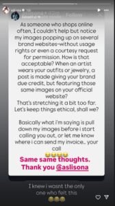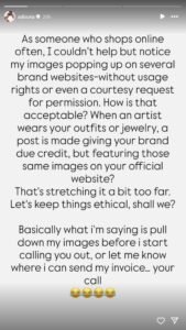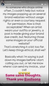 एक्ट्रेस ने उन सभी ब्रांड्स को चेतावानी दी, जिन लोगों ने उनकी तस्वीर अपने फैशन ब्रांड्स के प्रचार में कर रहें हैं, उन्होंने लिखा कि- “क्योंकि मैं अक्सर ऑनलाइन शॉपिंग करती हूं, मैंने देखा कि मेरी तस्वीरें कई ब्रांड वेबसाइट्स पर दिखाई दे रही हैं,ये कैसे ठीक है? जब कोई कलाकार आपके कपड़े या गहने पहनता है, तो पोस्ट करके ब्रांड को क्रेडिट दिया जाता है, लेकिन वही तस्वीरें आपकी ऑफिशियल वेबसाइट पर डालना? ये कुछ ज्यादा हो गया।