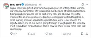 एक्टर सोनू सूद ने अपने एक्स पर एक्टर राजपाल की तारीफ करते हुए लिखा कि- ‘राजपाल यादव एक टैलेंटेड एक्टर हैं जिन्होंने कई सालों तक हमारे इंडस्ट्री को यादगार भूमिकाएं दी हैं। कभी-कभी लाइफ अनफेयर हो जाती है, टैलेंट के कारण नहीं बल्कि समय के खराब होने की वजह से। वह मेरी फिल्म का हिस्सा होंगे और मेरा मानना है कि यह हम सभी के लिए – प्रड्यूसर्स, डायरेक्टर्स और कुलीग के लिए एकजुट होने का समय है।’
