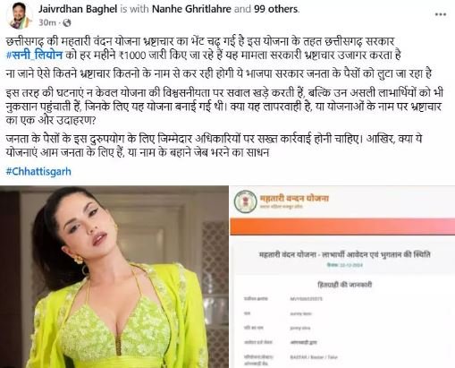 कांग्रेस नेता जयवर्धन बघेल ने यह दावा किया है और FB पोस्ट में लिखा, छत्तीसगढ़ की महतारी वंदन योजना भ्रष्टाचार का भेंट चढ़ गई है इस योजना के तहत छत्तीसगढ़ सरकार #सनी_लियोन को हर महीने ₹1000 जारी किए जा रहे हैं यह मामला सरकारी भ्रष्टाचार उजागर करता है।