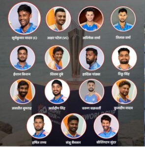 सूर्यकुमार यादव (कप्तान), अक्षर पटेल (उपकप्तान), अभिषेक शर्मा, तिलक वर्मा, संजू सैमसन, हार्दिक पंड्या, रिेंकू सिंह, शिवम दुबे, कुलदीप यादव, वॉशिंगटन सुंदर, हर्षित राणा, वरुण चक्रवर्ती, जसप्रीत बुमराह और अर्शदीप सिंह ईशान किशन।