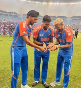 मैच प्रेजेंटेशन का आयोजन हुआ लेकिन कप्तान सूर्यकुमार यादव का न तो इंटरव्यू हुआ और न ही भारत ने ट्रॉफी ली। बिना ट्रॉफी के ही मैच प्रेजेंटेशन खत्म कर दिया गया। फिर सूर्या एंड कंपनी ने बिना ट्रॉफी के ही फोटो खिंचाई लेकिन टीम इंडिया ने मजेदार अंदाज में जश्न मनाया। सभी खिलाड़ी पोडियम पर बैठ गए और तस्वीरें खिंचवाई। इस दौरान कप्तान सूर्यकुमार ने वैसे ही जश्न मनाया जैसे रोहित शर्मा ने टी20 वर्ल्ड कप और चैंपियंस ट्रॉफी जीतने के बाद मनाया था। उन्होंने अर्शदीप और हार्दिक पंड्या पोडियम के कहने पर धीमी वॉक की और फिर खिलाड़ियों के साथ मिल गए।