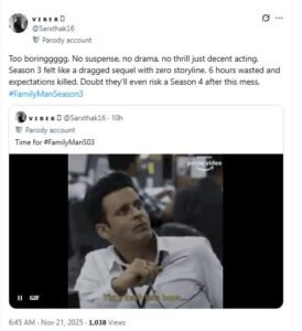 दूसरे यूजर्स ने सीरीज को बोरिंग बताया, कहा टाइम वेस्ट करने वाली सीरिज है उसने एक्स पर रिव्यू देते हुए लिखा कि-