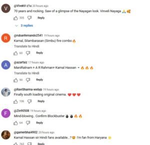 ‘ठग लाइफ’ का ट्रेलर देख फैंस खूब तारीफ कर रहे हैं। एक यूजर ने लिखा कि- ’70 साल की उम्र और अब भी कहर ढा रहे हैं कमल हासन।’ एक ने लिखा – ‘भाईसाहब क्या स्क्रीन प्रेजेंस है। एकदम माइंड ब्लोइंग। दिमाग के पुर्जे ही खोल दिए।’ एक ने लिखा, ‘एक्शन सीक्वेंस तो एकदम आग हैं आग। कमल हासन को कोई रिप्लेस नहीं कर सकता।’ एक ने लिखा-” Kamal Hassan sir Hindi fans available…?🤩 I’m fan from Haryana 🌟”