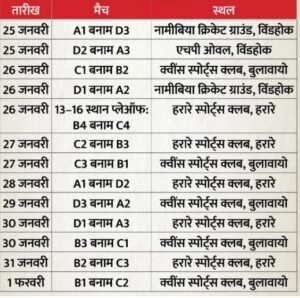 ग्रुप स्टेज में 24 मैच होंगे। सभी मुकाबले स्थानीय समयानुसार सुबह 9:30 बजे और भारतीय समयानुसार दोपहर 1 बजे से शुरू होंगे। टूर्नामेंट का पहला मैच 15 जनवरी को भारत और यूएसए के बीच बुलवायो के क्वींस स्पोर्ट्स क्लब मैदान में खेला जाएगा।
