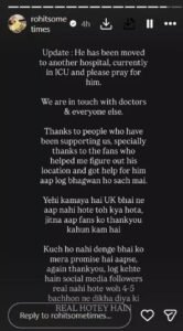 8 मार्च को मैनेजर ने इंस्टाग्राम पर एक स्टोरी डाली और उसमें लिखा कि- ‘उन्हें दूसरे अस्पताल में भर्ती कराया गया है, फिलहाल वे आईसीयू में हैं। कृपया उनके लिए प्रार्थना करें। हम डॉक्टरों और सभी के संपर्क में हैं। हमारा साथ देने वाले सभी लोगों का धन्यवाद, खासकर उन फैंस का, जिन्होंने मुझे अनुराग डोभाल का पता लगाने और उनके लिए मदद जुटाने में सहयोग किया। आप लोग भगवान हो सच में।”