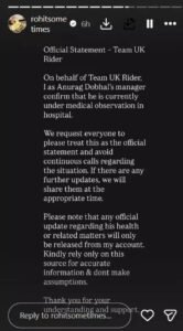 पहले इंस्टाग्राम पर एक स्टोरी शेयर करते हुए उनके हॉस्पिटल में भर्ती होने की जानकारी दी थी और लिखा था कि- ‘टीम यूके राइडर की ओर से, मैं अनुराग डोभाल के मैनेजर के रूप में पुष्टि करता कि अभी वह अस्पताल में डॉक्टरों की निगरानी में हैं। प्लीज इसे ही आधिकारिक बयान मानें और इस स्थिति के बारे में बार-बार कॉल करने से बचें। यदि कोई और अपडेट आता है, तो हम उसे सही समय पर शेयर करेंगे।’