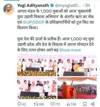 UP CM Gorakhpur Visit: इसके अलावा सीएम योगी ने आगरा मंडल के 1 हजार युवाओं को आज ‘मुख्यमंत्री युवा उद्यमी विकास अभियान’ के अंतर्गत ऋण का चेक एवं @UP_ODOP के प्रशिक्षणार्थियों को टूल किट का वितरण किया। साथ ही सीएम ने कहा कि युवा देश की ऊर्जा के प्रतीक हैं। आज 1 हजार नए युवा उद्यमी प्रदेश और देश के विकास में अपना योगदान देने के लिए तत्पर होकर आगे बढ़ रहे हैं। सीएम ने सभी युवाओं को हार्दिक बधाई एवं शुभकामनाएं दीं।