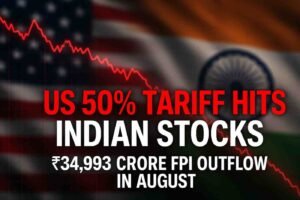 us tariff impact indian share market august 2025: भारतीय शेयर बाजाऱ पर अगस्त 2025 मे अमेरिका द्वारा लगाए गये 50% टैरीफ का असर दिखना शुरू हो गया है जिसके चलते फॉरेन इन्वेस्टर्स ने भारतीय शेयर बाजार से करीब 34,993 करोड़ रुपए (लगभग 4 बिलियन डॉलर करोड़ रुपए) निकाल लिए हैं । यह पिछले छह महीनों में सबसे बड़ी बिकवाली है। इससे पहले फरवरी में FPI ने ₹34,574 करोड़ की बिकवाली की थी।