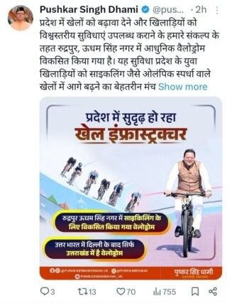 Uttarakhand Weather: तो वहीं आज उत्तराखंड के मुखिया पुष्कर सिंह धामी ने प्रदेश में खेलों को बढ़ावा देने और खिलाड़ियों को विश्वस्तरीय सुविधाएं उपलब्ध कराने के संकल्प के तहत रुद्रपुर, ऊधम सिंह नगर में आधुनिक वैलोड्रोम विकसित किया गया है। आगे सीएम ने एक्स करते हुए बोले कि यह सुविधा प्रदेश के युवा खिलाड़ियों को साइकलिंग जैसे ओलंपिक स्पर्धा वाले खेलों में आगे बढ़ने का बेहतरीन मंच प्रदान करेगी। इतना ही नहीं सीएम ने कहा कि हमारी सरकार खेल इंफ्रास्ट्रक्चर को सुदृढ़ करने के साथ-साथ युवा प्रतिभाओं को प्रोत्साहित करने के लिए निरंतर कार्य कर रही है।