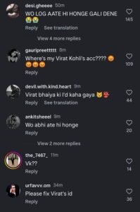 विराट का इंस्टाग्राम अकाउंट बंद होते ही सोशल मीडिया में तहलका मच गई, जिसने भी विराट के सोशल मीडिया अकाउंट बंद की जानकारी दी उनकी पोस्ट पर फैंस ने तरह – तरह के कमेंट किए। फैंस काफी निराश दिखे। इतने परेशान हो गए की अनुष्का के पोस्ट पर कमेंट करके विराट के बारें में पूछने लगे।