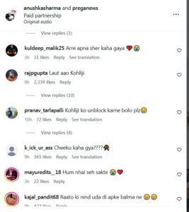 एक फैन ने लिखा कि- ‘ भाभी भाईया कहां हैं?, दूसरे ने लिखा कि- ‘भाईया का फोन किधर है???’, तीसरे ने लिखा- ‘चीकू का इंस्टाग्राम’, एक ने लिखा कि- ‘रातों की नींद उड़ा दी आपके बलमा ने’, एक ने लिखा कि- ‘कोहली जी को अनब्लॉक करने को बोलो प्लीज’। कोहली के फैंस में उनका क्रेज साफ दिखाई दे रहा है।