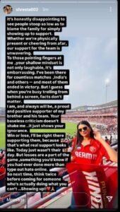 ‘यह देखना बहुत निराश करता है कि लोग सपोर्ट के लिए आने वाले परिवार पर दोष मढ़ देते हैं। भले ही हम शारीरिक रूप से मौजूद रहे या दूर हों, टीम के लिए हमारा समर्थन लगातार जारी रहेगा। जो लोग मुझ पर अंगुली उठा रहे, उनकी ओछी मानसिकता न केवल हंसने लायक है बल्कि यह शर्मिंदा करने वाली है. मैं अनगिनत मैचों के दौरान मौजूद रही हूं, इनमें भारत और बाकी मैच शामिल हैं और ज्यादातर में जीत मिली. लेकिन जब आप स्क्रीन के पीछे से ट्रोल करने में बिजी रहते हो तब तथ्य मतलब नहीं रखते हैं।’