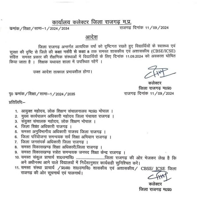 Rajgarh जिले में सोमवार रात से ही तेज बारिश का दौर जारी है। मौसम विभाग के द्वारा जिले में आगामी 24 घंटे के अंदर भारी बारिश की चेतावनी जारी की है। जिले में लगातार हुई बारिश के कारण मोहनपुरा डैम में जलस्तर बढ़ने के कारण 10 गेट खोल दिए गए हैं, जिसके चलते नेवज नदी उफान पर आ गई है। वहीं तेज बारिश को देखते हुए प्रशासन ने अलर्ट भी जारी किया है। इधर तेज बारिश के कारण राजगढ़ कलेक्टर के द्वारा मंगलवार सुबह नर्सरी से लेकर 8 तक के सभी स्कूलों का अवकाश घोषित कर दिया गया है।