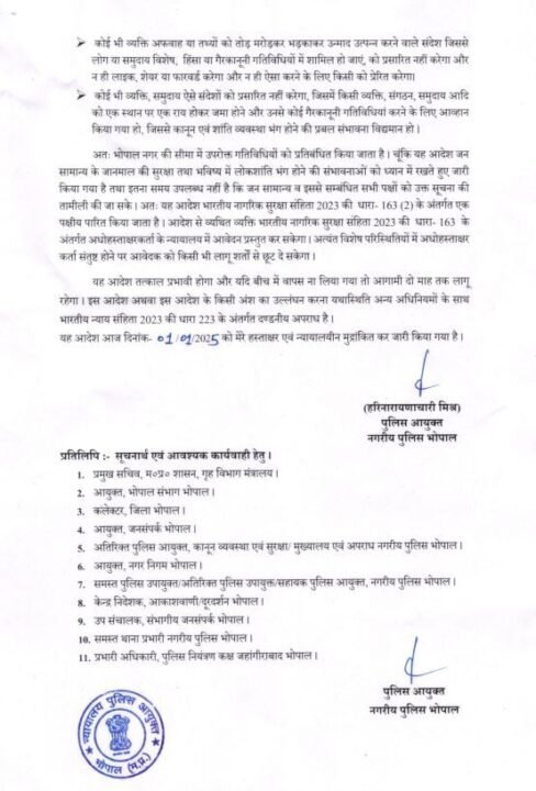 भोपाल पुलिस कमिश्नर ने जारी किया आदेश