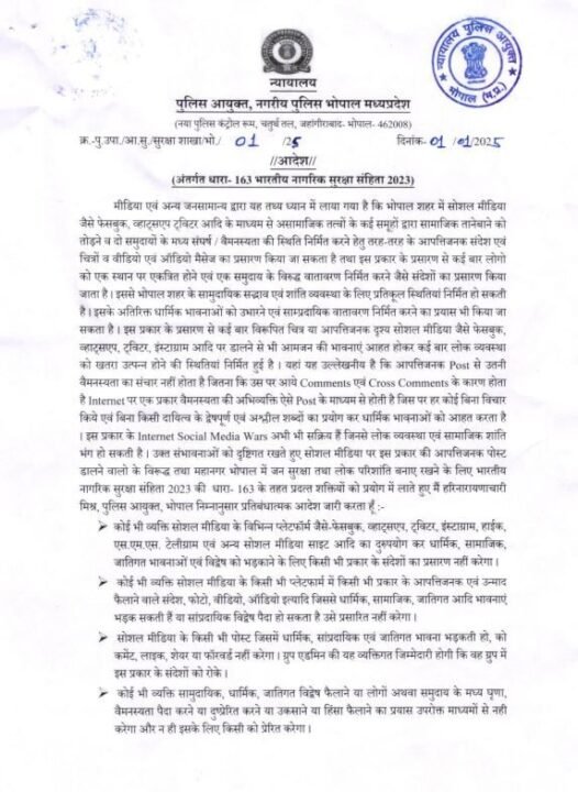 Bhopal Breaking: आपको बता दें कि भारतीय नागरिक सुरक्षा संहिता 2023 की धारा 163 के तहत यह आदेश लागू किया गया है। आदेश के अनुसार सोशल मीडिया प्लेटफॉर्म जैसे फेसबुक, इंस्टाग्राम, व्हाट्सएप, और टेलीग्राम पर धार्मिक और सामाजिक सौहार्द को बिगाड़ने वाली गतिविधियों पर कड़ी निगरानी रखी जाएगी। यदि किसी व्यक्ति ने धार्मिक भावना भड़काने वाली पोस्ट डाली है या किसी अन्य ने उसे लाइक या कमेंट किया तो उन सभी के खिलाफ कार्रवाई की जाएगी।
